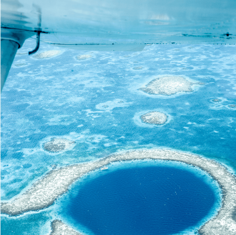 Fly over the Blue Hole with your family, then take your meetings while they explore the Cayes.